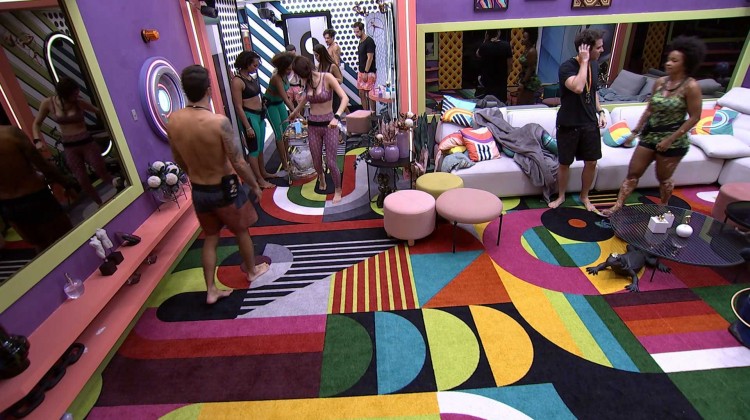 Para entrar no clima, eles recebem os comes e bebes deste sábado, 12/3. Eslovênia e Laís pegam os salgadinhos e se animam ao lado dos outros confinados.