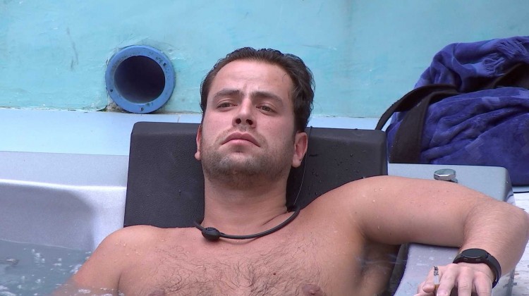 Gustavo aproveita parte da tarde na hidromassagem da casa. Sozinho, o brother relaxa no local com olhar pensativo.